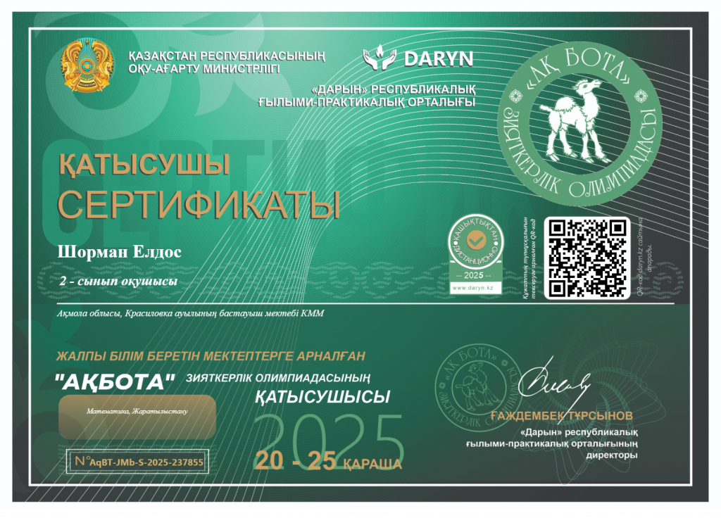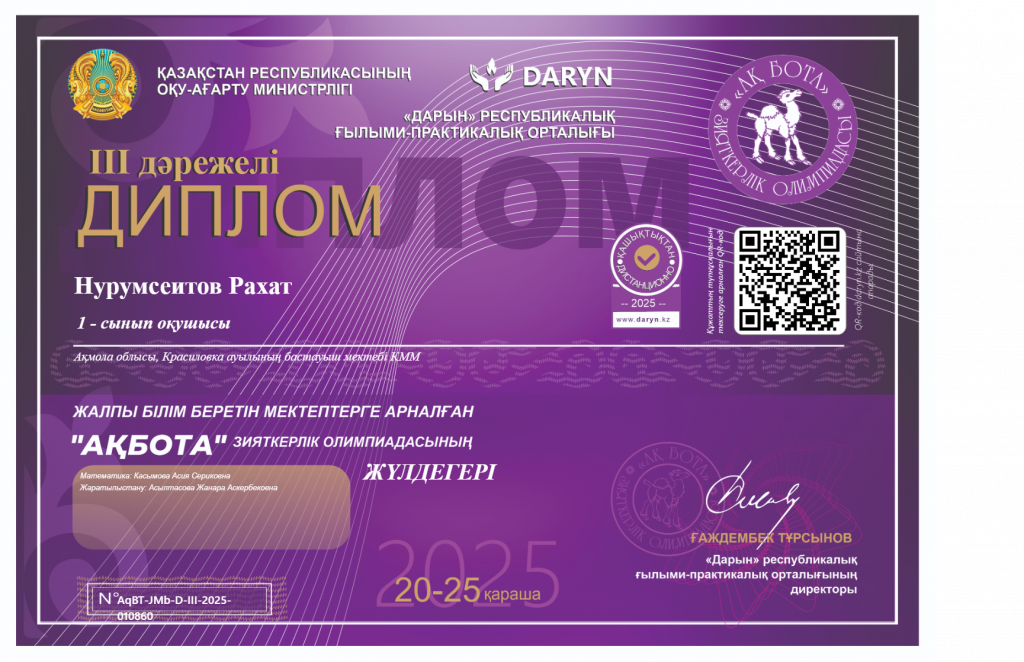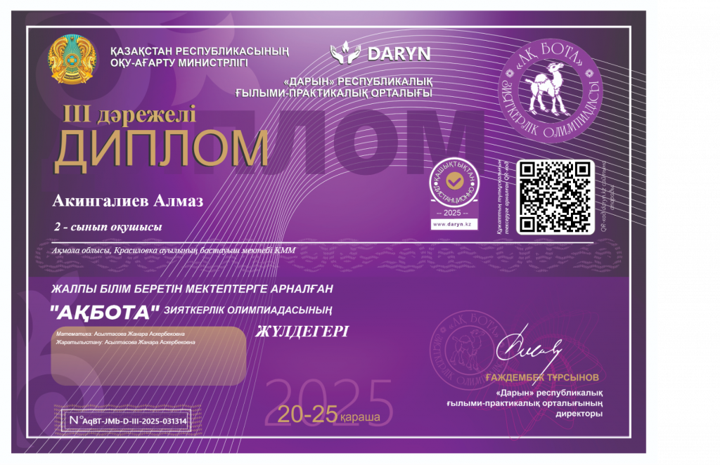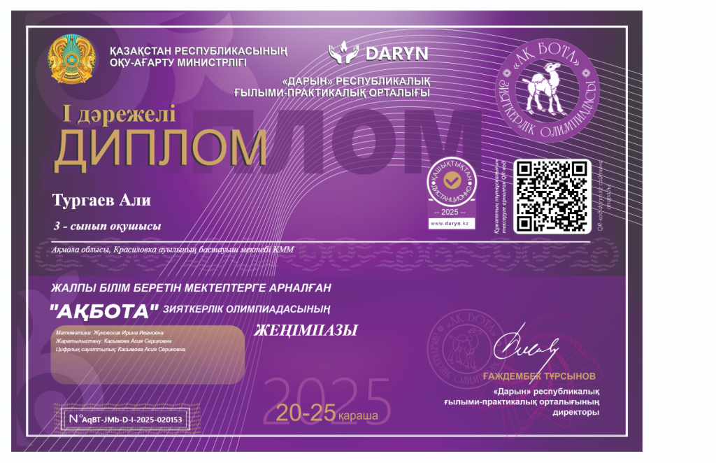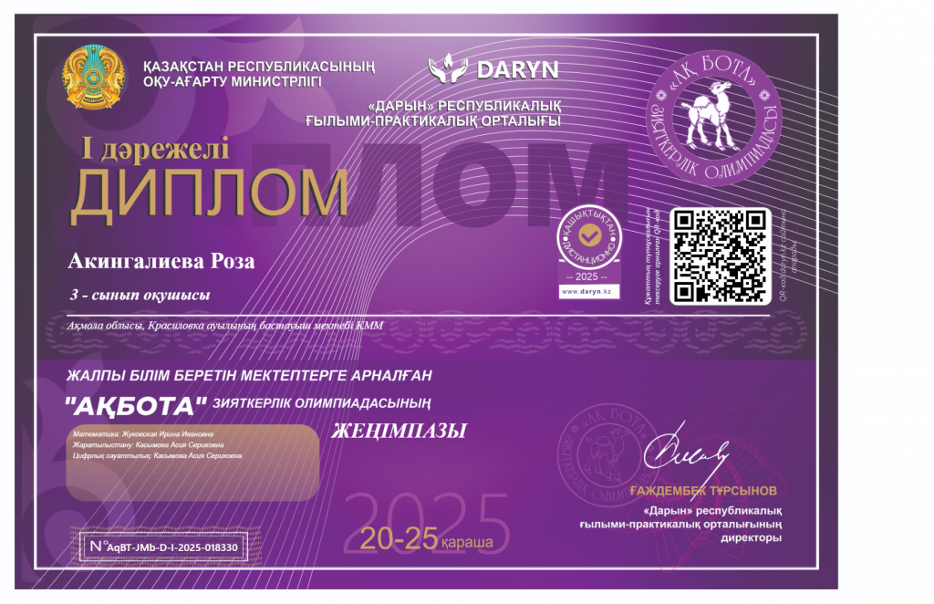 ҚР Білім Министрлігінің "Дарын" республикалық ғылыми-практикалық орталығы "РМҚК 2024 жылғы 20-25 қараша аралығында жалпы білім беретін мектептер арасында жаратылыстану-математикалық бағыт бойынша" Ақбота " зияткерлік олимпиадасын өткізді, онда біздің мектеп оқушылары қатысып, жүлделі орындарға ие болды. 1-сынып оқушысы Нұрымсейітов Рахат - 3 орын, 2-сынып оқушылары Акингалиев Алмаз-3 орын, Косарев Никита-2 орын, 3-сынып оқушылары Акингалиева Роза-1 орын, Торғаев Ата - 1 орын, 4-сынып оқушысы Қасым Әлихан - 1 орын. Жарайсыңдар балалар!